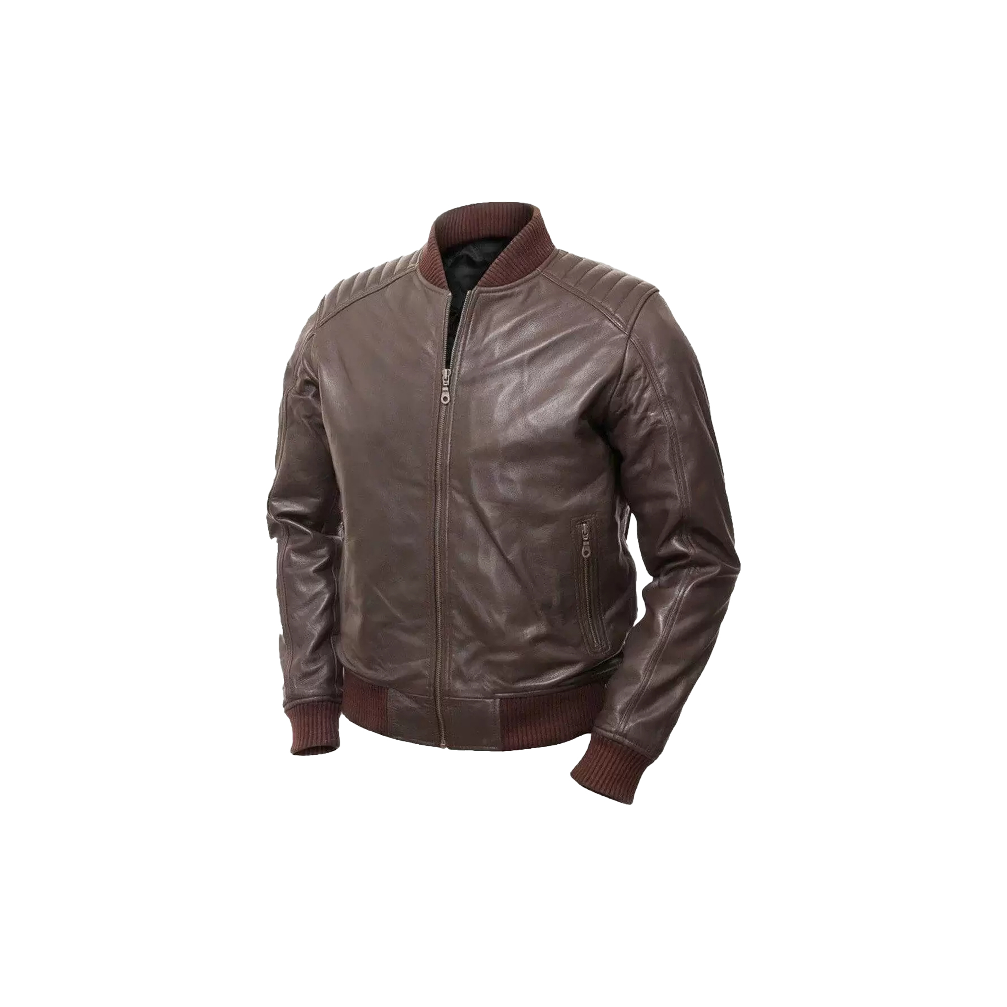 Premium leather bomber jacket with a classic waist-length cut.